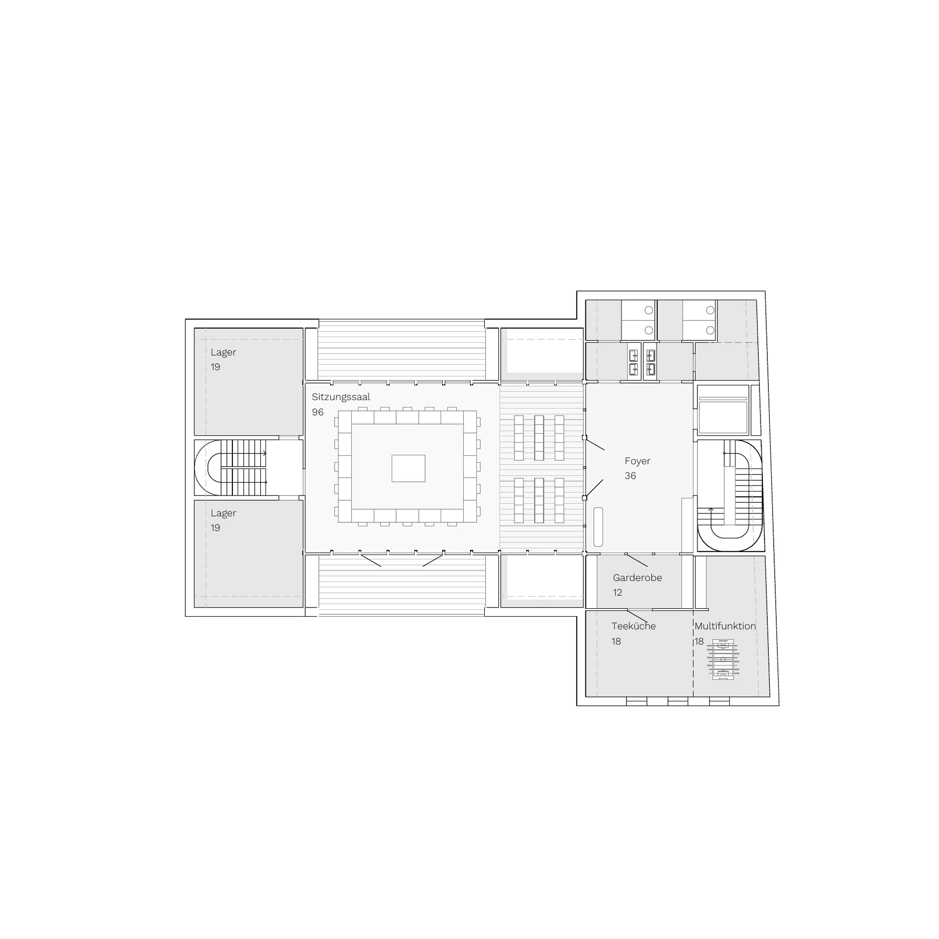 Es soll ein Ort für die Bürger von Schömberg sein, die mit ihren Anliegen offen und einladend in den Räumlichkeiten empfangen werden. Folgerichtig wurde der Haupteingang zum Bürgerbüro am neu gestalteten Rathausplatz angelegt. An der Infotheke werden die Bürger zum Wartebereich der Bürgerbüros weitergeleitet. Die Rathausgasse ist Teil des Erdgeschosses. Hier befindet sich der Eingang zum Rathaus, der sich bewusst aus dem prominenten Platz zurücknimmt und als halböffentliche Adresse fungiert. Als repräsentativer Raum öffnet sich der Trausaal zum Platz hin und empfängt Besucher und Hochzeitsgäste im Rathaus. Die gewünschte übersichtliche und funktionale Erschließungsstruktur wird durch die beiden Treppenkerne gewährleistet. Die unabhängige Nutzung des künftigen Sitzungssaals sowie die barrierefreie Erschließung aller Ebenen werden vom Foyer aus sichergestellt. Die Verwaltungsflächen im neuen Rathaus befinden sich in den ersten beiden Obergeschossen und sind, wie gewünscht, zu Beginn als Einzelbüros gegliedert. Die vorgesehene Holzskelettstruktur ermöglicht ein flexibles Gebäudesystem für die Zukunft und kann beispielsweise „offenes Arbeiten“ abbilden. Der Sitzungssaal, der überwiegend für Gemeinderatssitzungen genutzt werden soll, ist wie gewünscht im dritten Obergeschoss verortet und über den Foyerbereich für vielfältige kommunale Nutzungsoptionen bespielbar.